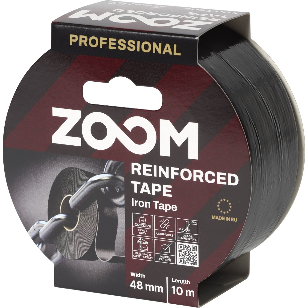 ZOOM IRON TAPE- aukštos kokybės juosta su puikiais senėjimui ir temperatūrai atspariais sintetinio kaučiuko klijais. Juosta „Iron Tape“ pasižymi labai stipriu pradiniu prilipimu ir itin stipriai sukimba su labai šiurkščiais paviršiais (plytomis, betonu, akmenimis ar kt.), taip pat su mažai energijos turinčiais paviršiais (polietilenu ar kt.). Juosta pasižymi itin didele tempimo jėga – 700 N/25 mm