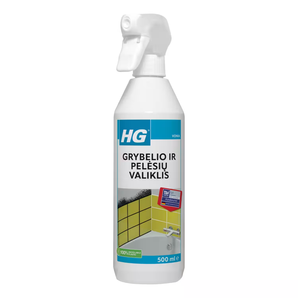 HG Pelėsio, grybelio valiklis valo pilkas, juodas, rudas ir žalias dėmes, paliktas pelesių, dumblių, grybelio kerpių ir kt.