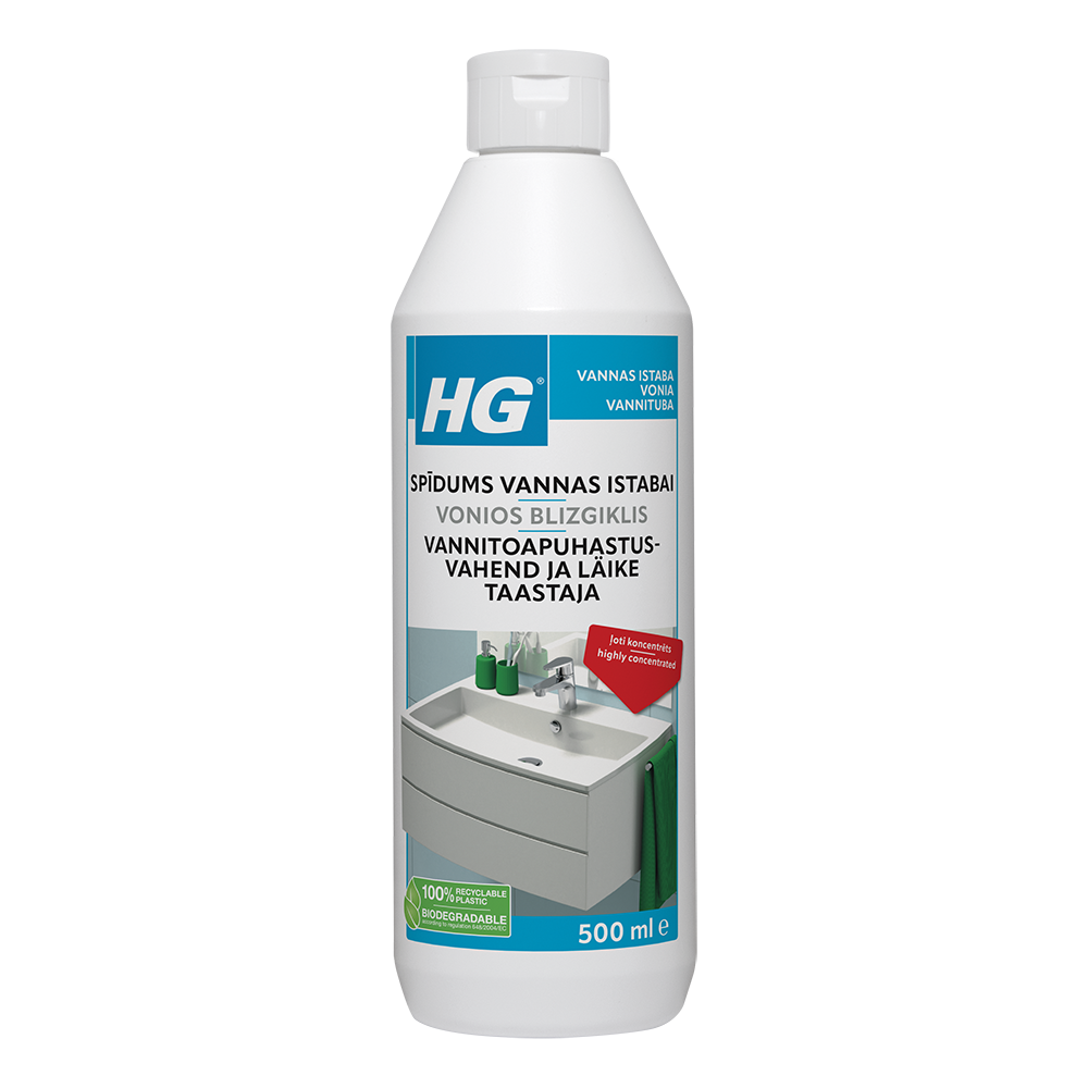 HG priemonė suteiks nepakartojamą blizgesį visam vonios kambariui: kriauklei, voniai, čiaupui, plytelėms.