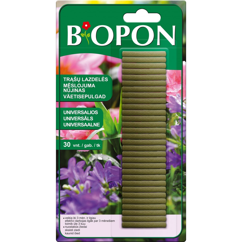 Koncentruotos trąšos lazdelių formos pavidalu, visiškai ištirpstančios ir maitinančios augalus 2 mėnesius.