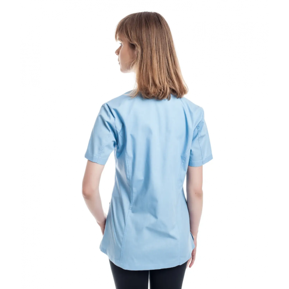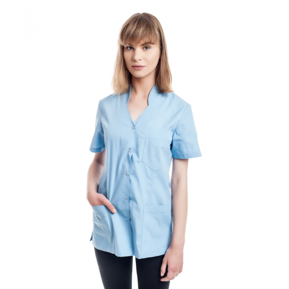 Stilingas medicininis chalatas užsegamas spaudėmis.