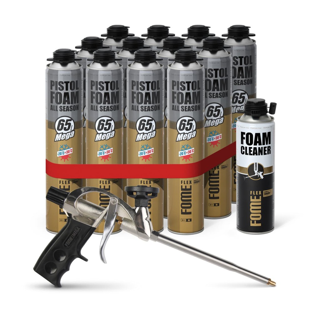Meistro rinkinys 12 vnt. montavimo putų Fome Flex ALL SEASON 65 L+ montavimo putų valiklis Fome Flex FOAM CLEANER+ ergonomiškas putų pistoletas fome Flex Mega Edition.