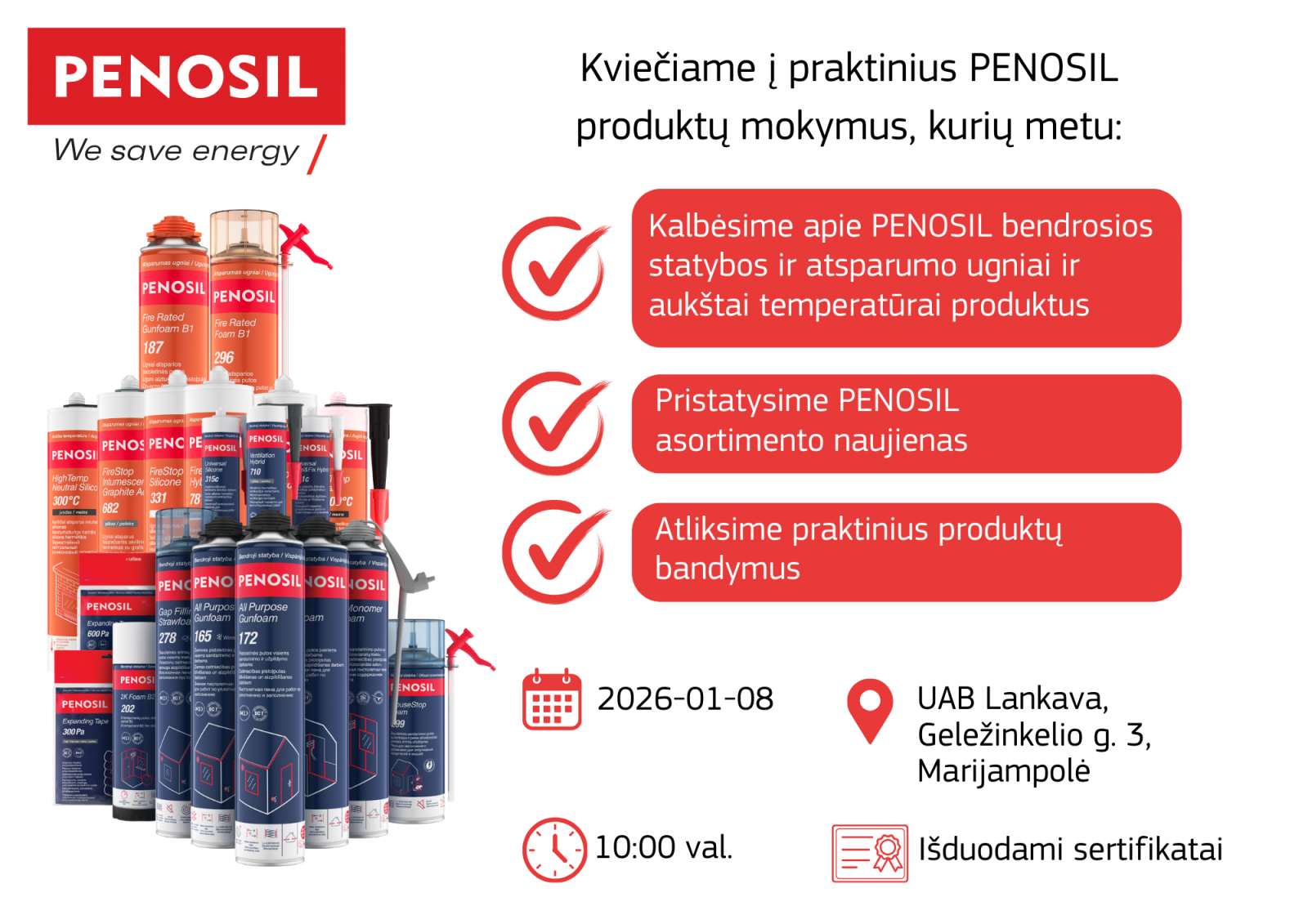 Kviečiame statybos profesionalus, meistrus, rangovus ir PENOSIL produktų naudotojus dalyvauti nemokamuose praktiniuose PENOSIL produktų mokymuose, kurie vyks UAB „Lankava“ Marijampolės filiale.