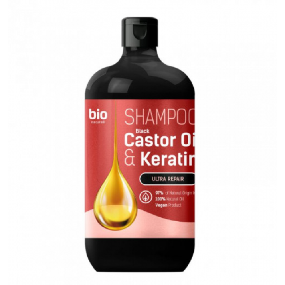 Plaukų šampūnas su ricinos aliejumi ir keratinu.