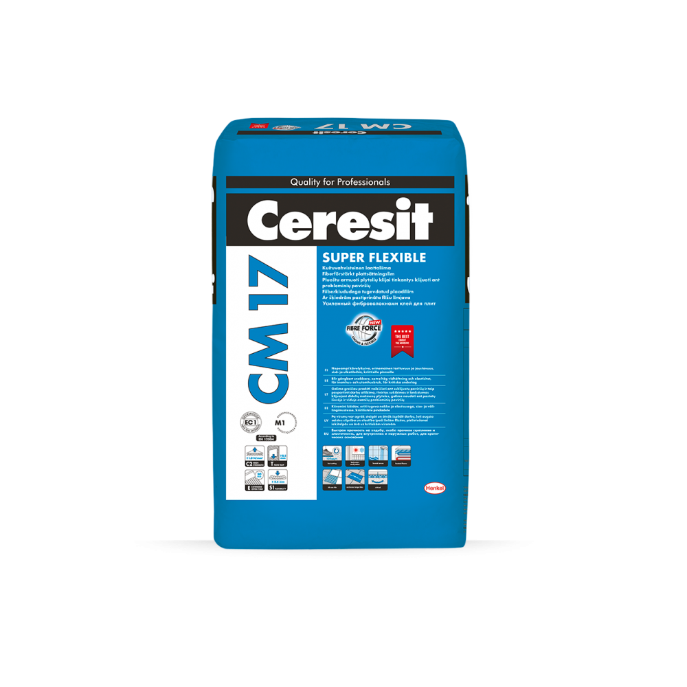 Mišinys Ceresit CM 17 Super Flexible skirtas keraminėms (glazūruotoms, plytelėms iš terakotos), cemento, klinkerio ir akmens masės (išskyrus marmuro) plytelėms tvirtinti ant besideformuojančių pagrindų.