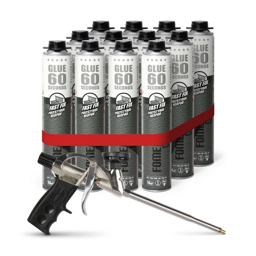 Meistrų rinkinys Fome Flex 60 SEC Fast Fix polistirolo ir neoporo putos- klijai (12 vnt) ir ergonomiškas putų pistoletas Fome Flex Mega Edition.