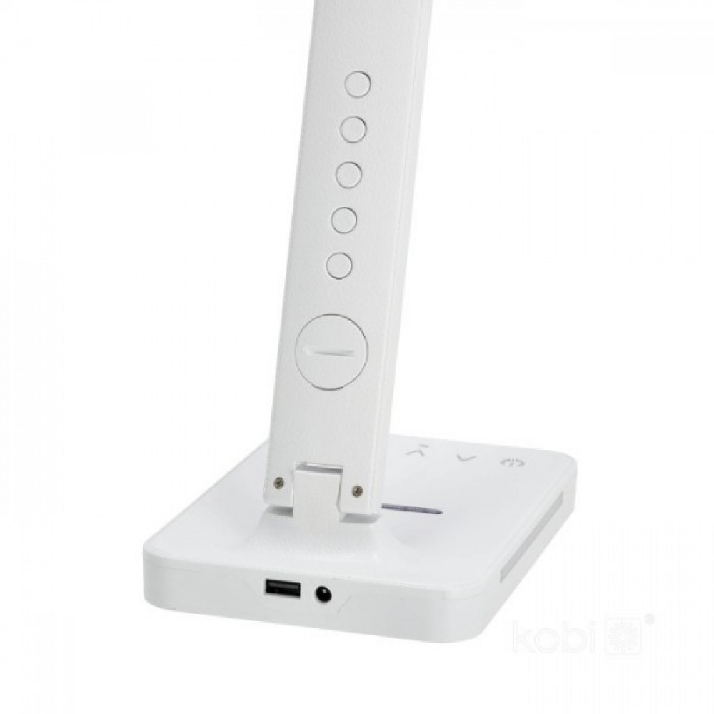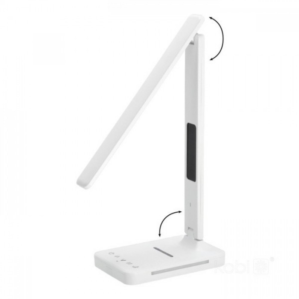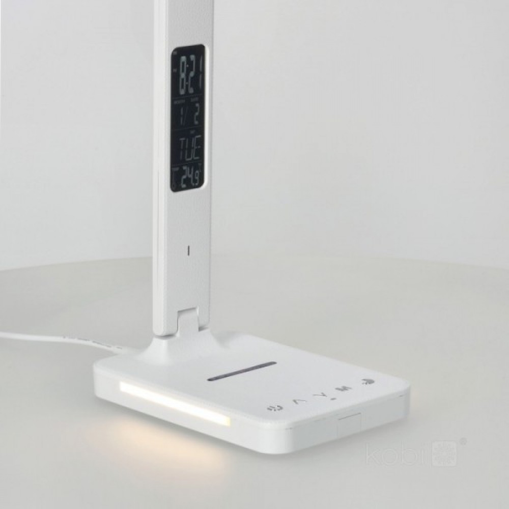 LED stalo šviestuvas NOBLITE 7W , baltas, 3000-6000K, dimeriuojamas. Šviestuvas turi ekraną su data, laiku ir temperatūra, maitinamą CR1632 baterija (įtraukta), su integruotu papildomu naktiniu šviestuvėliu, taip pat su belaidžio telefono krovimo funkcija (Qi 10W).