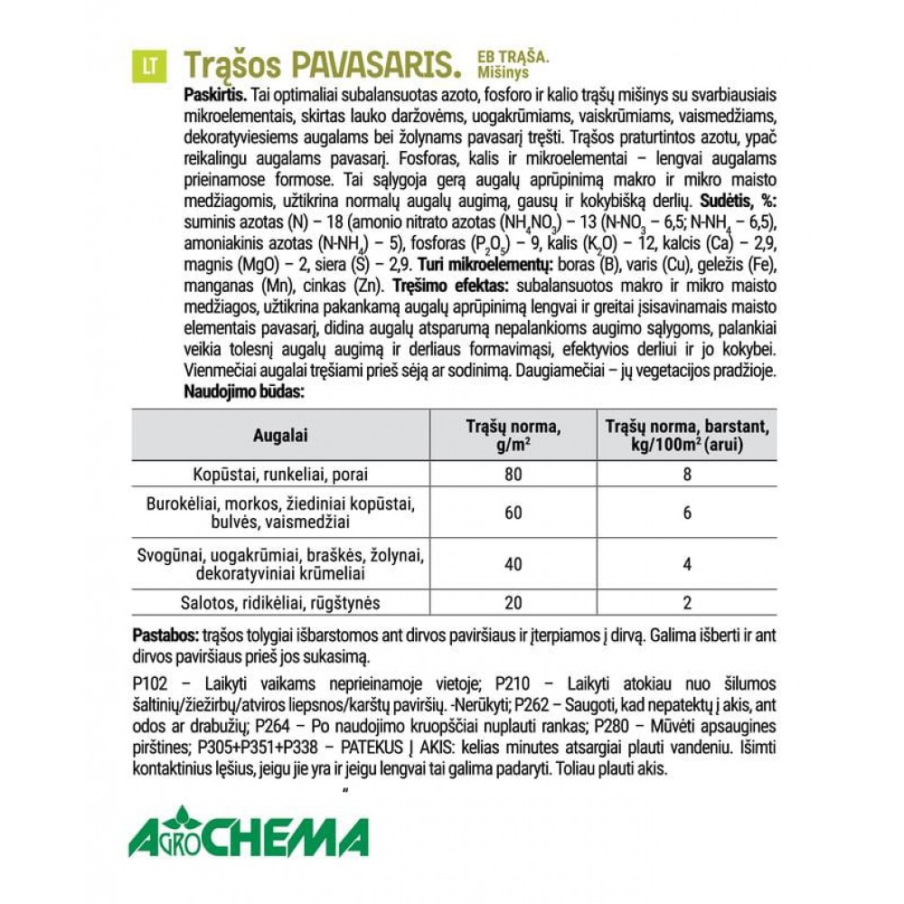 Optimaliai subalansuotas azoto, fosforo ir kalio trąšų mišinys su svarbiausiais mikroelementais, skirtas lauko daržovėms, uogakrūmiams, vaiskrūmiams, vaismedžiams, dekoratyviniems augalams bei žolynams pavasarį tręšti. Trąšos praturtintos azotu, ypač reikalingu augalams pavasarį. Fosforas, kalis ir mikroelementai – lengvai augalams prieinamose formose, todėl augalai tinkamai aprūpinami makro ir mikro maisto medžiagomis, užtikrinant normalų augalų augimą, gausų ir kokybišką derlių.