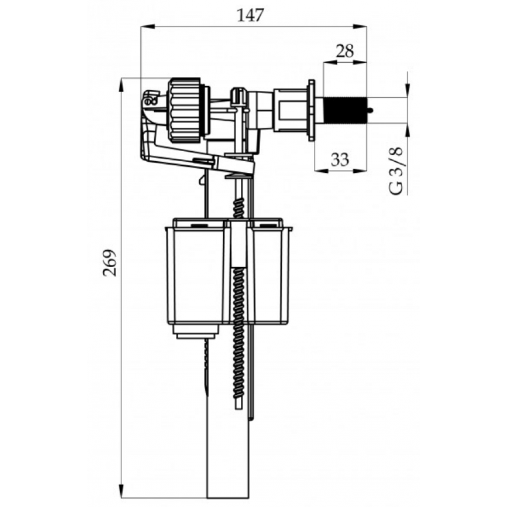 Šoninis tualeto bakelio užpildymo mechanizmas su plastikinė 1/2" jungtimi.
