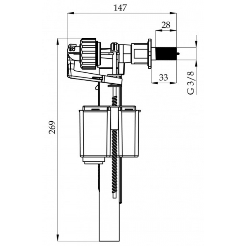 Šoninis tualeto bakelio užpildymo mechanizmas su plastikinė 3/8" jungtimi.