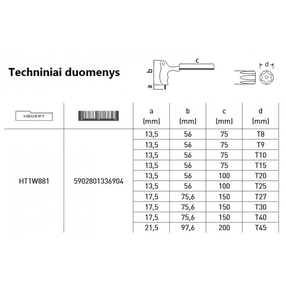 Hogert HT1W881 ilgų Torx tipo raktų rinkinys.